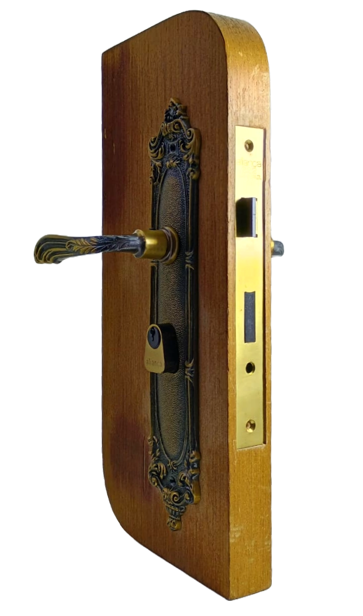 Fechadura para porta externa estilo Colonial; maçaneta trabalhada; cilindro ou tambor triângulo grande.