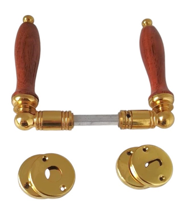 MAÇANETA OU TRINCO PARA PORTA INTERNA ; PUNHO DE MADEIRA E BASE LATÃO DOURADO; MODELO ALAVANCA ; PARA DECORAR SUA PORTA DA COZINHA, SALA DE JANTAR OU CLOSET COM ESTILO COLONIAL EM UM DESIGN MODERNO ACOMPANHA CONJUNTO DE GUARNIÇÃO OU ROSETAS PARA PORTA INTERNA.
