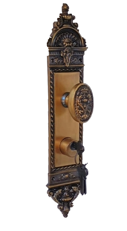 Fechadura para porta externa estilo Colonial modelo império, segura, design atemporal e acabamento de latão em alta qualidade, fácil instalação para colocação nova ou reposição.