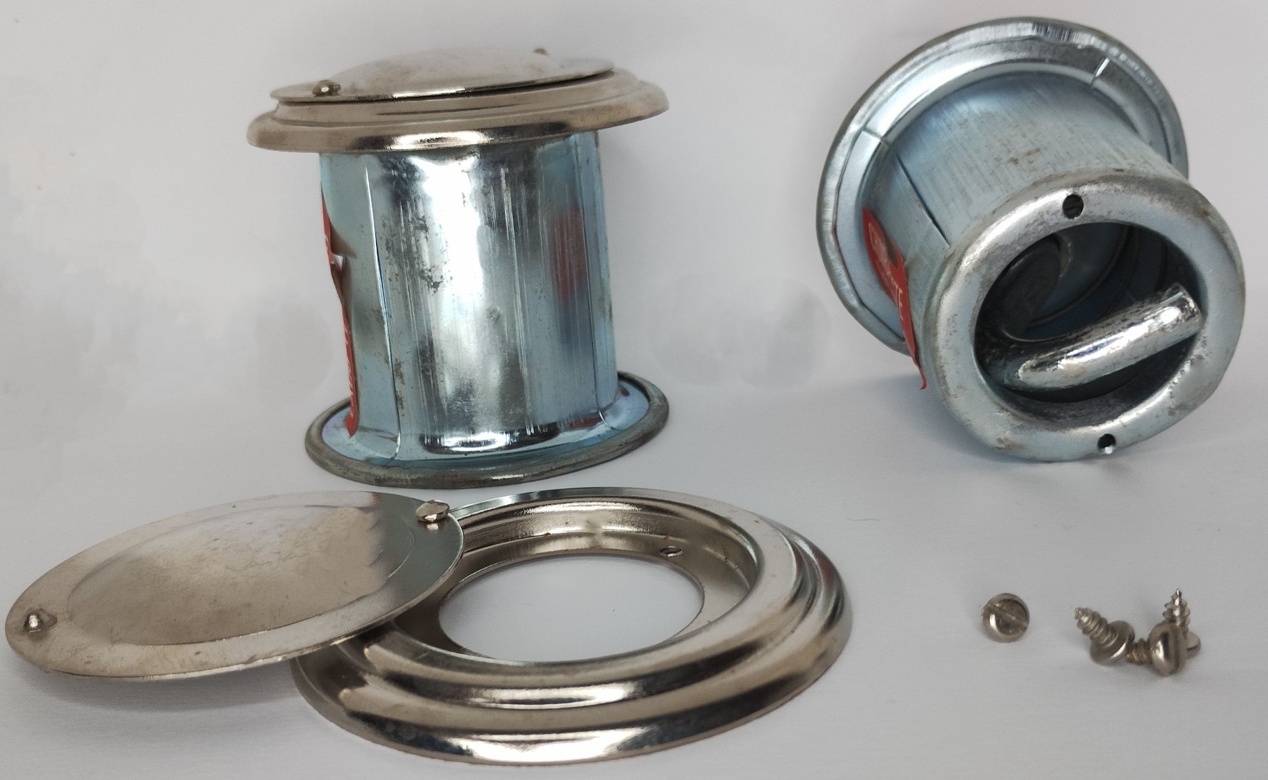 GANCHO FERRO CROMADO; DE EMBUTIR COM MOLA DE RECOLHIMENTO E TAMPA DE ACABAMENTO
