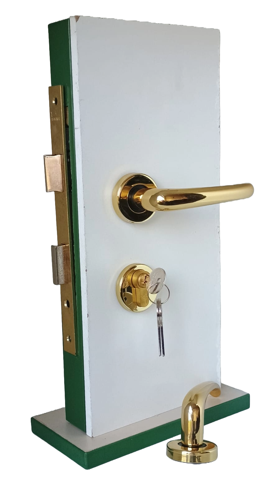 Fechadura dourada Dorma Mida 55mm, para porta externa, estilosa, design moderno e acabamento em alta qualidade, fácil instalação para colocação nova ou reposição.